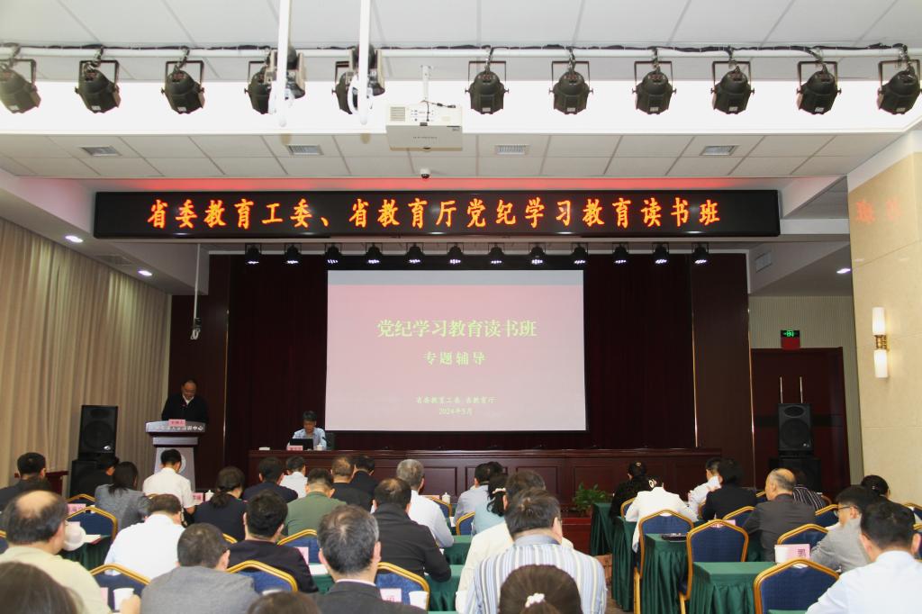 按照中共中央办公厅《关于在全党开展党纪学习教育的通知》要求,省委教育工委、省教育厅高度重视、精心筹备,率先对厅机关所有处级干部开展学习教育,学习贯彻习近平总书记关于党纪学习教育的重要讲话和重要指示精神,学习新修订的《中国共产党纪律处分条例》并开展交流研讨。读书班采取专题辅导、分组领学、研讨交流、警示教育相结合的方式进行。邀请西北大学法学院潘怀平教授作新修订的《中国共产党纪律处分条例》解读辅导。省纪委委员、省纪委监委驻省教育厅纪检监察组组长、省委教育工委委员赵军作专题警示教育。读书班通过专家学者解读、原原本本研读,引导全体党员干部把遵规守纪牢牢刻印在心,深刻领悟“两个确立”的决定性意义,坚决做到“两个维护”,切实把思想和行动统一到党中央决策部署上来。