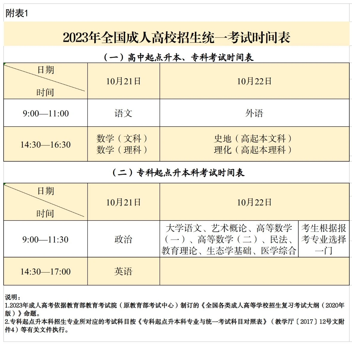 根据教育部安排,自治区2023年成人高校招生全国统一考试(简称“成人高考”)将于2023年10月21日至22日举行。成人高考设高中起点升专科、高中起点升本科和专科起点升本科(下称“高起专”“高起本”“专升本”)三种招生类型。