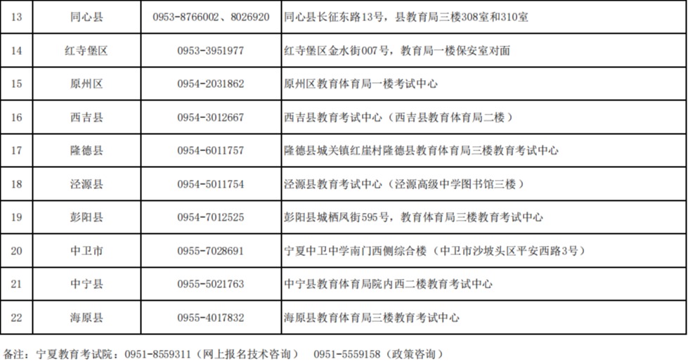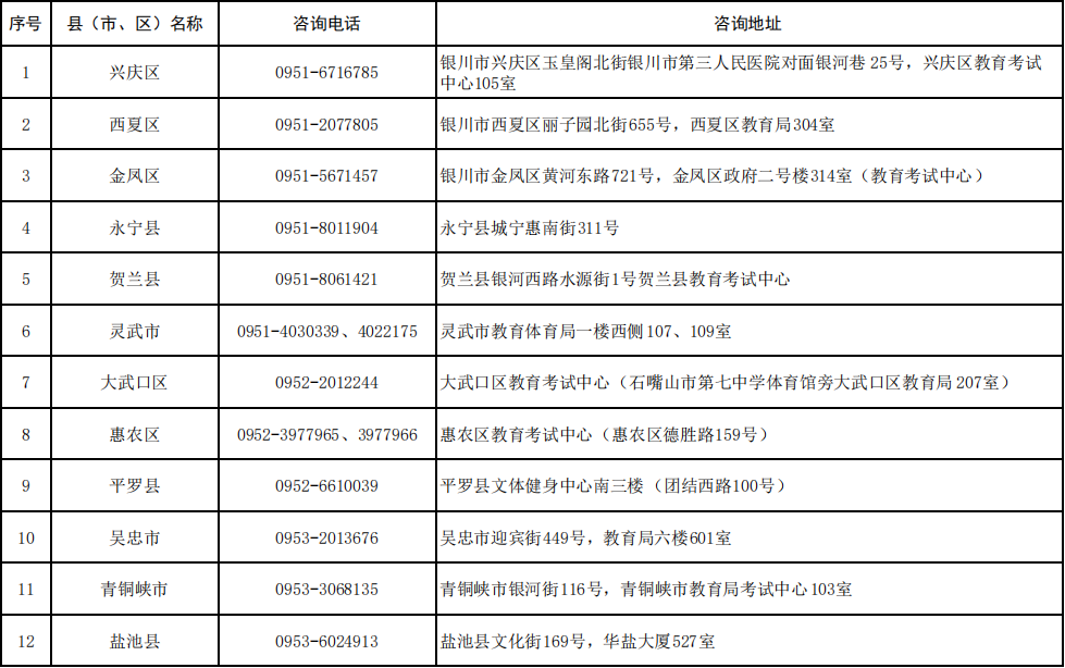 宁夏2025年成人高考报名各县(市、区)咨询电话及地址