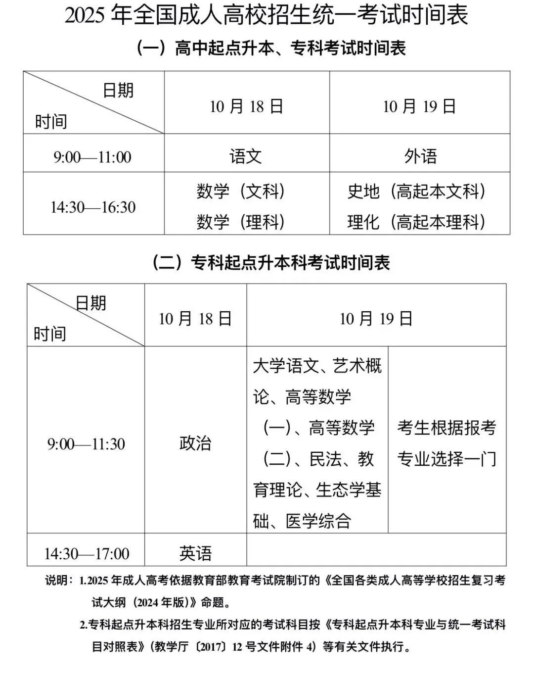 根据教育部统一安排,2025年成人高校招生全国统一考试(简称成人高考)将于20251018日至19举行。招生类型分高中起点升本科(以下简称高起本)、高中起点升专科(以下简称高起专)和专科起点升本科(以下简称专升本)三种。在校学习形式分脱产、非脱产两种,脱产最短学习时间为:高起本四年、高起专和专升本两年,非脱产最短学习时间为:高起本五年、高起专和专升本两年半。