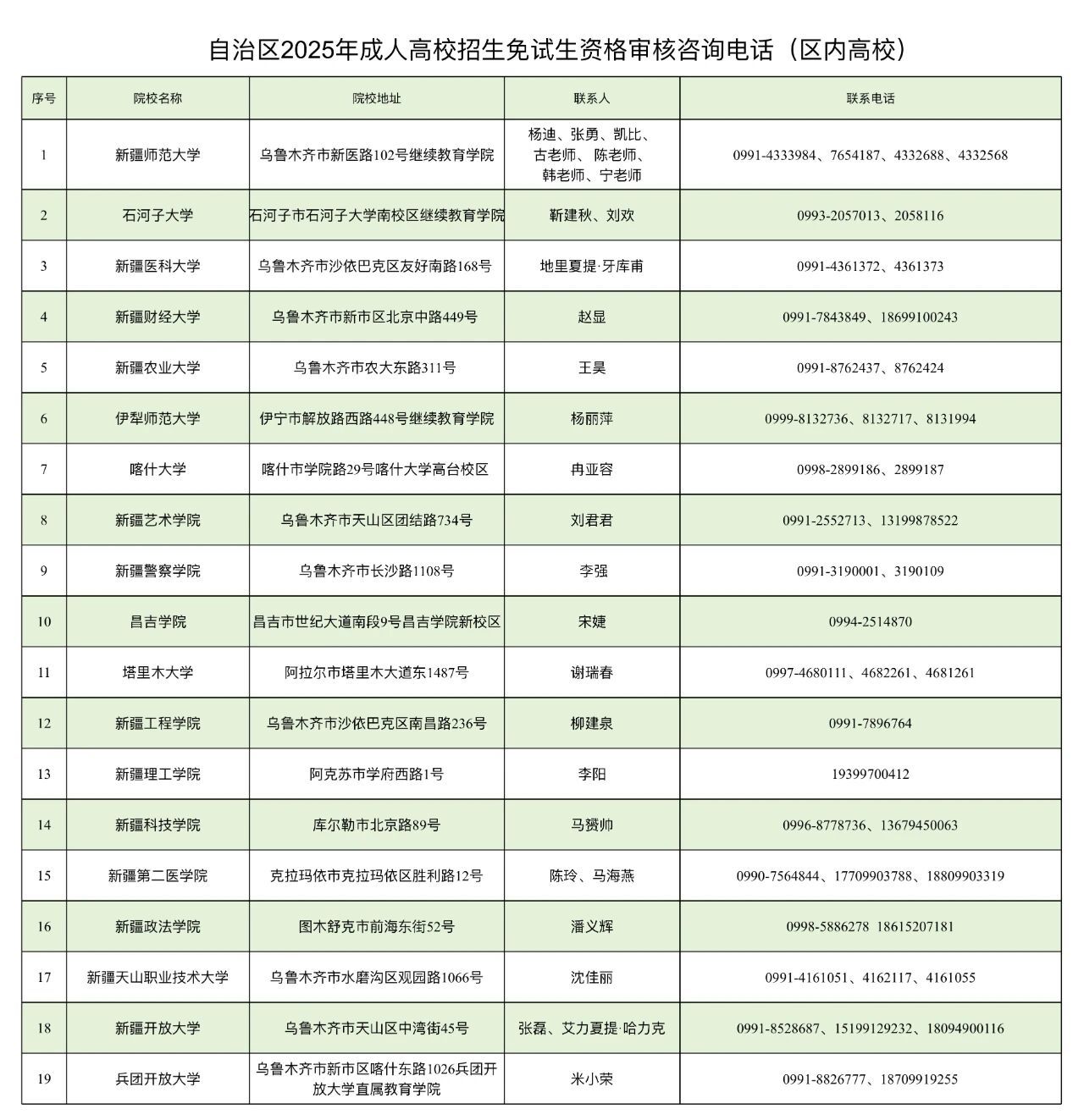 考生可登录新疆教育考试院官方网站查看《关于做好新疆维吾尔自治区2025年成人高校考试招生工作的通知》详细内容。新疆维吾尔自治区2025年成人高校招生照顾加分登记表》《新疆维吾尔自治区2025年成人高校招生免试入学申请表考生在新疆教育考试院官方网站下载