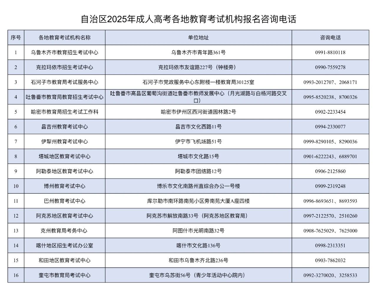 101012起,完成报考审核、缴费的考生在新疆教育考试院官方网站自行下载打印准考证。自治区2025成人高考全疆共设16个考区考点设在各地、州、市人民政府(行署)所在地国家教育考试标准化考点考生所选考区一经确认无法更改,因考区选择错误无法参加考试的考生,责任由考生个人承担。最终考点以考生《准考证》信息为准。