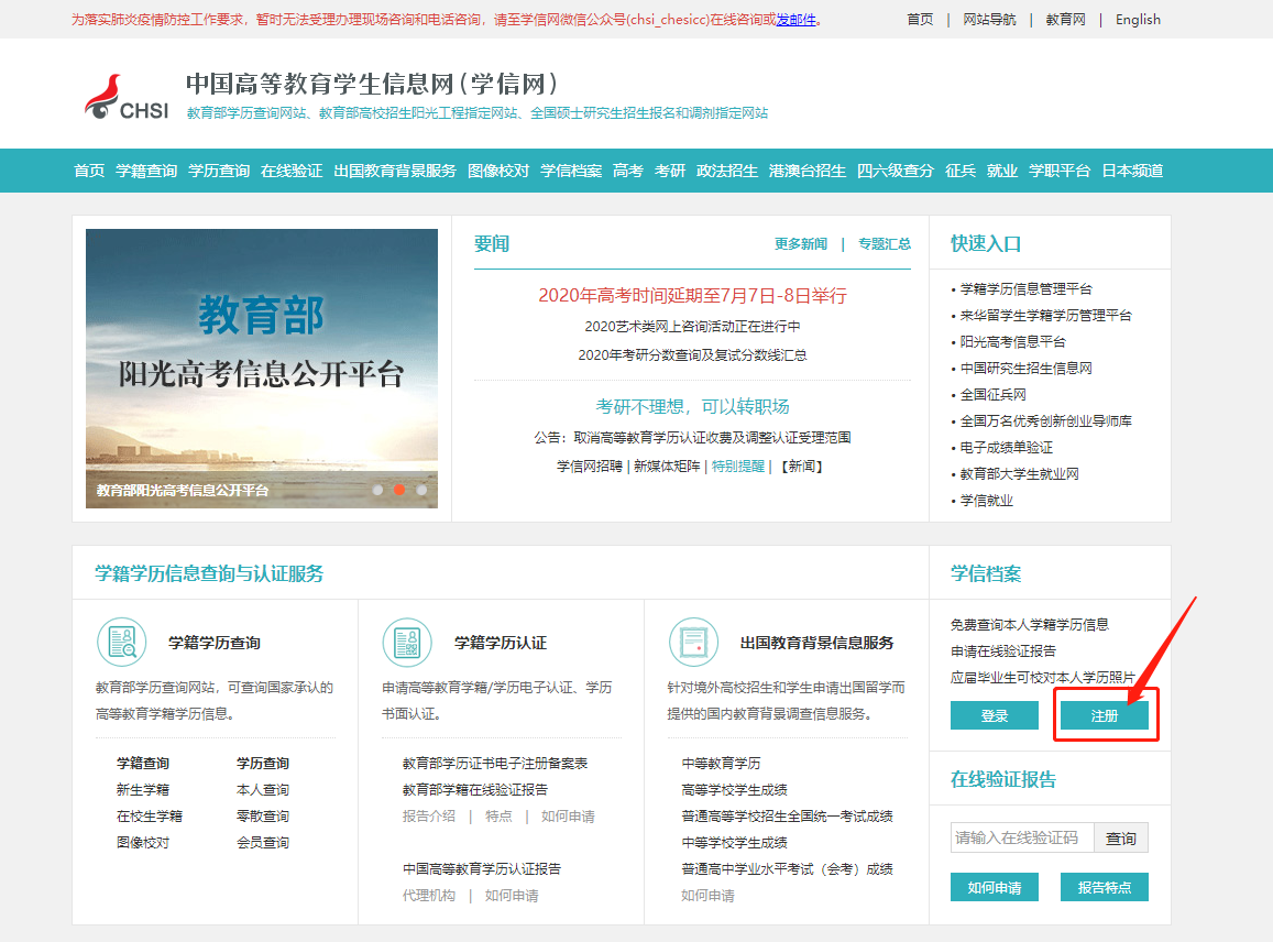 我校高等学历继续教育2020届毕业生毕业资格审核工作正在有序进行,为了各项工作的顺利进行,请及时登录“中国高等教育学生信息网”(学信网)https://www.chsi.com.cn,实名注册,进行本人各项信息的校对。可参考如下步骤:
