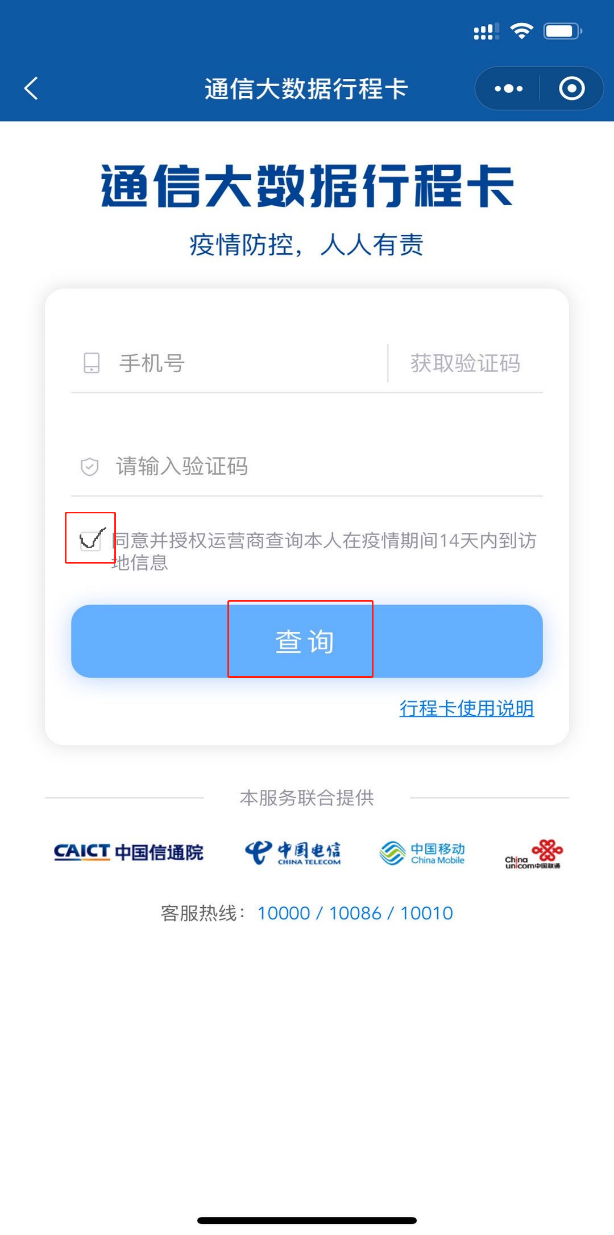 (2) 进入小程序,点击“防疫行程卡”;输入本人手机号,以及接收到的验证码,勾选“同意并授权运营商查询本人在14天内到访地信息”,之后点击“查询”;