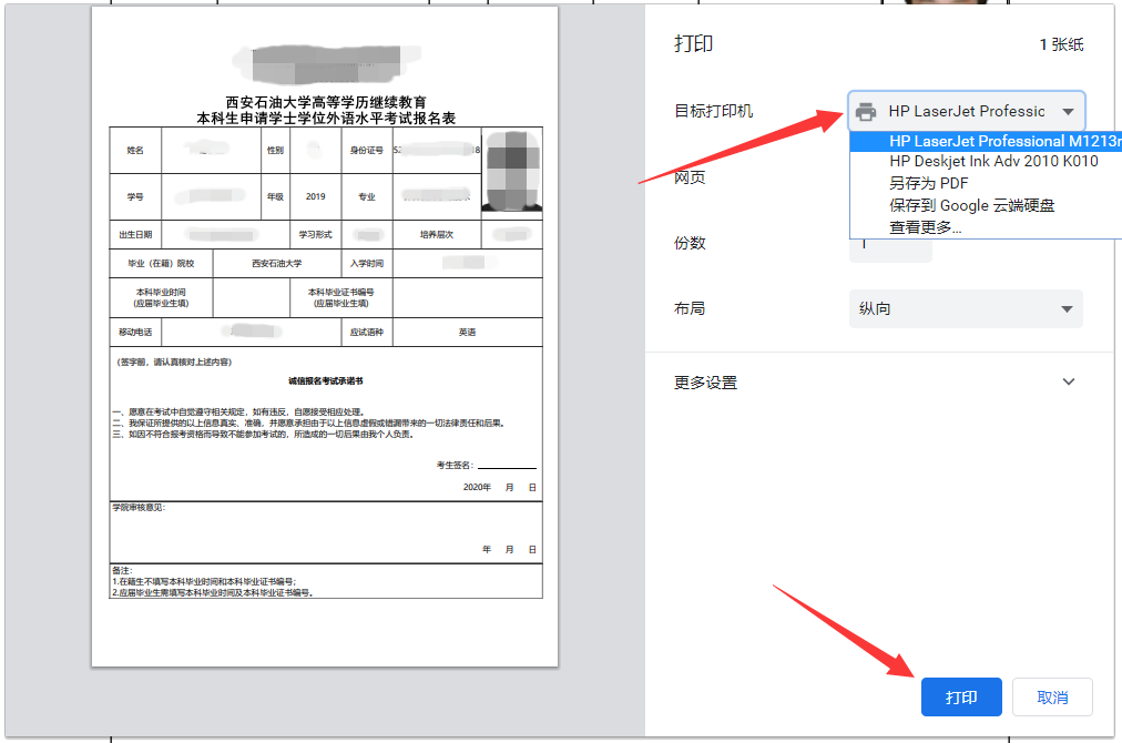 在生成的表格页面上方,点击“打印《考试报名表》”按钮。