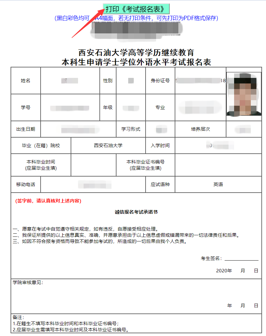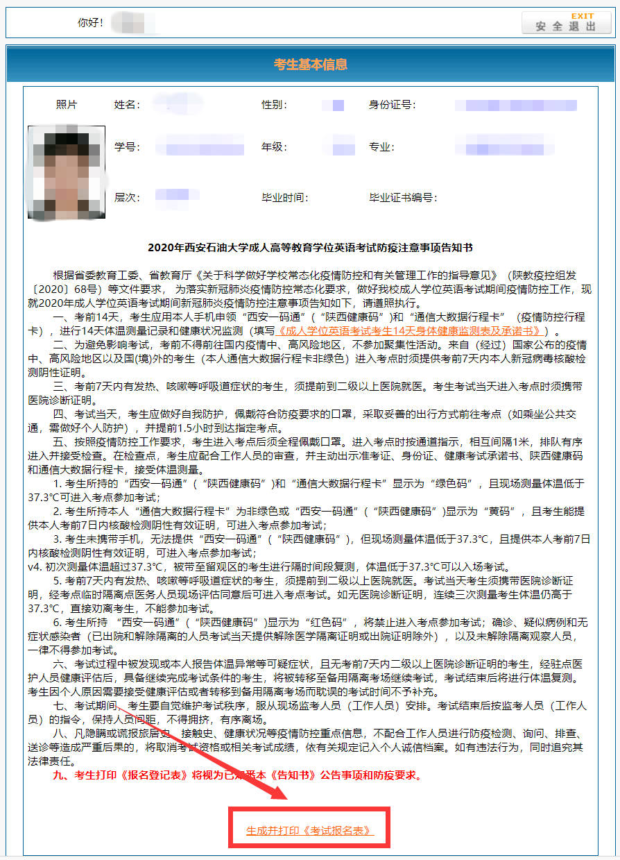 登录成功后,请仔细阅读《2020年taptap188成人高等教育学位英语考试防疫注意事项告知书》,下载《身体健康监测表及承诺书》,如实进行填写并签名,随后点击页面下方的“生成并打印《考试报名表》”。