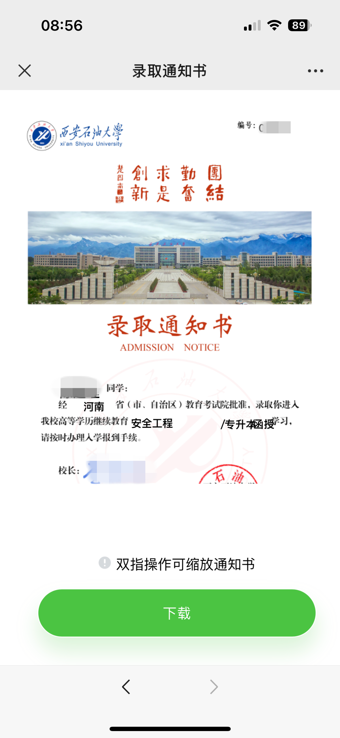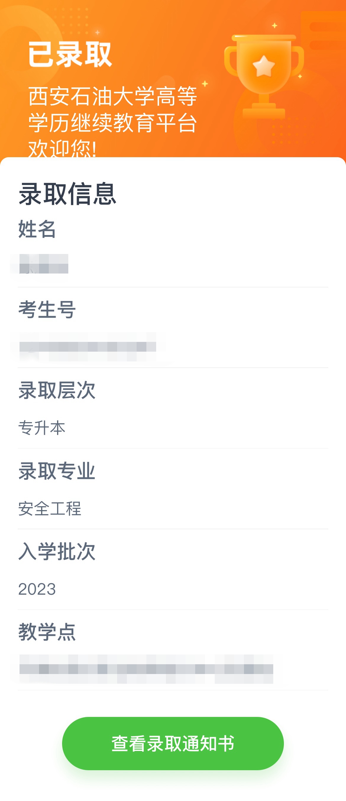 2023级新生同学你好!欢迎进入taptap188高等学历继续教育学习,请根据要求自行下载打印《录取通知书》并妥善保存,于入学报到时携带。