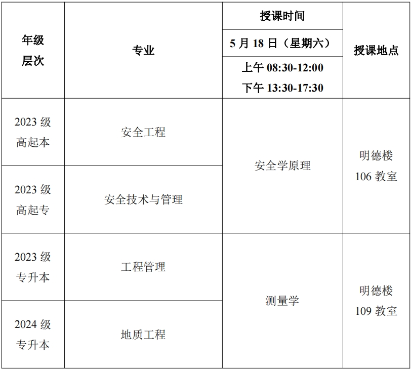 2024年春季学期第五次(5月18日)线下教学课程表