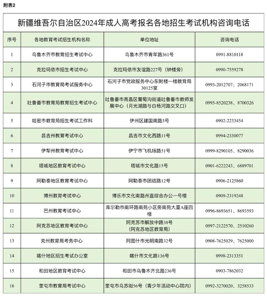 考生可登录新疆教育考试院官方网站查看《关于做好新疆维吾尔自治区2024年成人高校考试招生工作的通知》详细内容。报名期间,考生如遇疑问,可在工作时间拨打所在地、州、市招生考试机构和成人高考报名点咨询电话咨询。