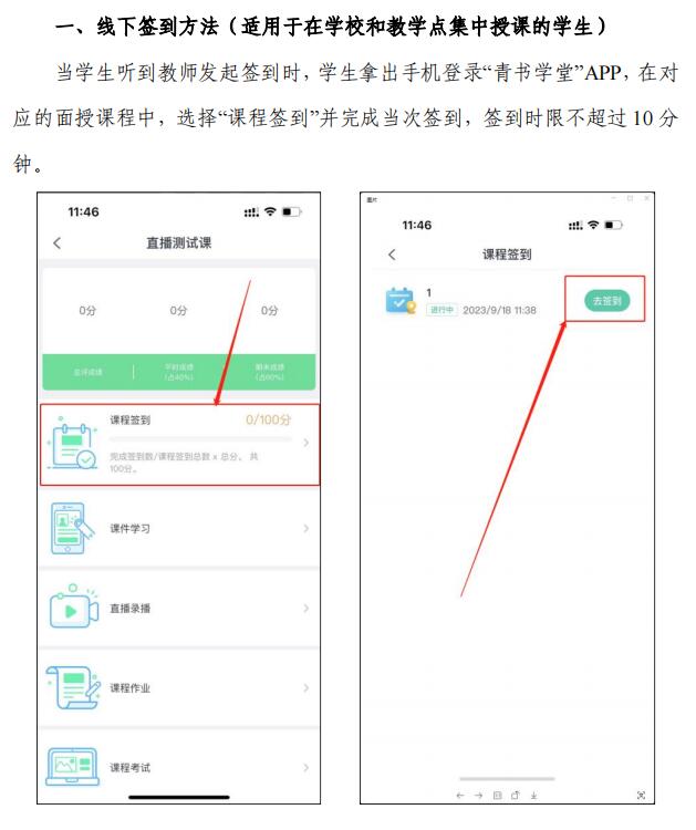 无论线下教学还是直播教学,授课期间,学生都应根据教师提示通过“青书学堂”APP进行课程签到,签到方法见附件2,签到情况将纳入平时成绩。