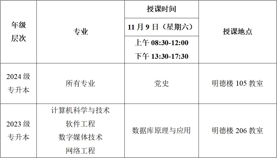 2024年秋季学期第三次(11月9日)线下教学课程表