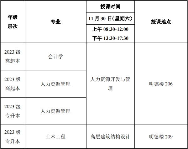 2024年秋季学期第六次(11月30日)线下教学课程表