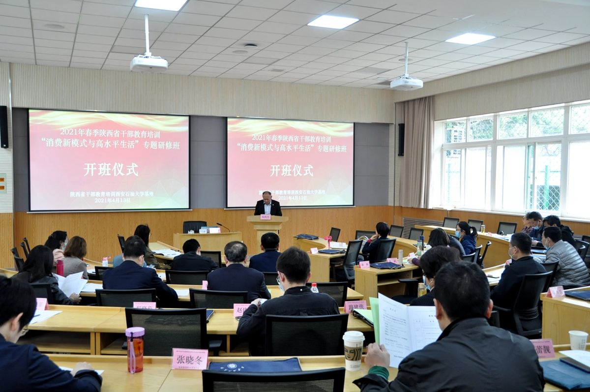 4月13日上午,2021年春季陕西省干部教育培训“消费新模式与高水平生活”专题研修班在我校培训中心顺利开班。taptap点点188副院长吴民生参加开班仪式,并简要介绍了我校发展沿革及培训基地工作开展情况。